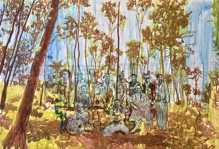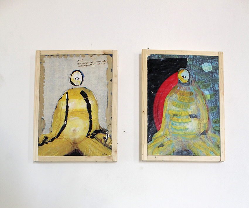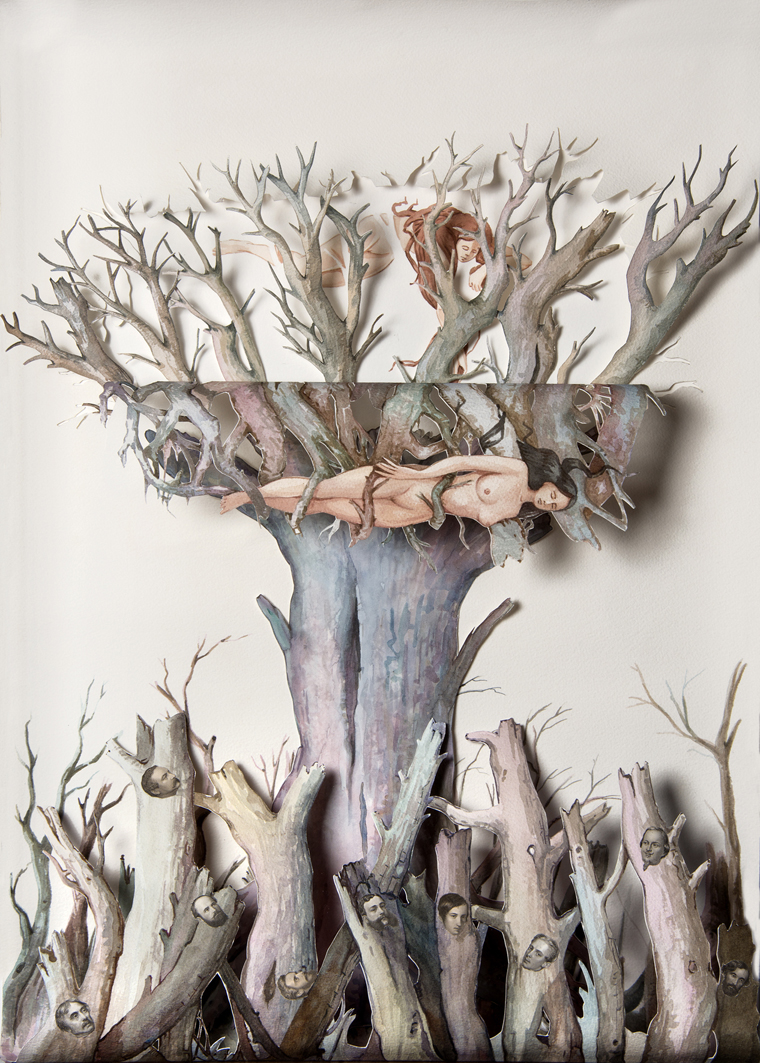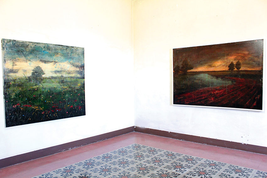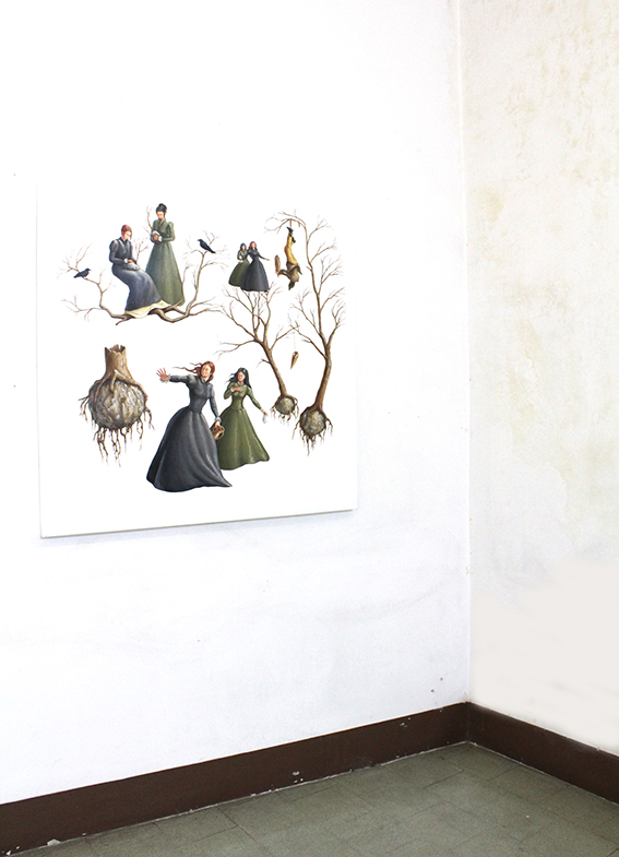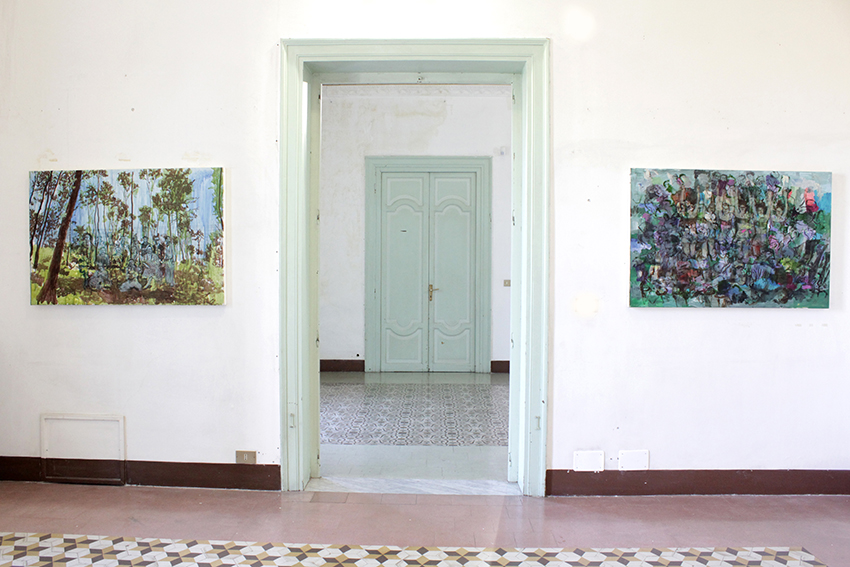La collettiva è orchestrata secondo un uso plurideclinato della pittura: da quello rituale con cui Franco Rasma cristallizza oggetti/idoli sospesi alle arcaiche figure di Salvatore Vitagliano (divinità ermafrodite, grandi madri, etc.) la cui violenza tellurica emerge, come un’ipallage, nel trattamento pittorico materico. Dai frastagliati roghi di intagli di carta, popolati da diavoli e vittime, firmati Vanni Cuoghi alle transizioni affastellate su tela di streghe, fantasmi ed esseri evanescenti di Gianluca Capozzi. Il tutto, fino alle atmosfere oniriche e brumose dai toni pastello di Federico Infante e al percepibile genius loci che presiede ai paesaggi di Jernej Forbici coi quali – nel marcescente degrado già innescato in cotanta bellezza – si chiude il cerchio di una ciclicità che torna alla morte.