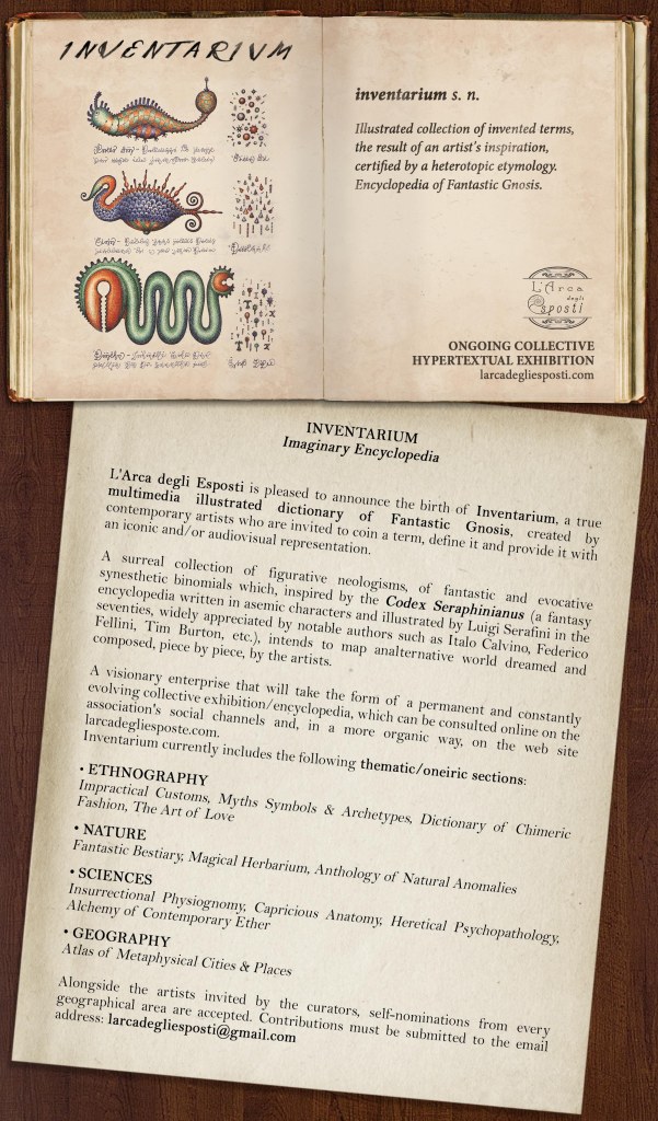 L’Arca degli Esposti è lieta di annunciare la nascita di Inventarium, vero e proprio Dizionario illustrato multimediale della Gnosi Fantastica, firmato da artisti contemporanei invitati a coniare un termine, definirlo e fornirne una rappresentazione iconica e/o audiovisiva.