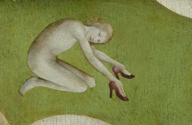 La scarpa per mani, quintessenziale feticcio atavico, vittima per secoli di quella damnatio memoriae che ciclicamente colpisce i reprobi come i probi, torna a rinascere grazie alla mai abbastanza apprezzata criptoteratoarcheologia inversa che ci restituisce questa immonda meraviglia figlia di un’era aurea che del mal camminar fece talento, ove l’inciampo era grazia, lo armonioso callo medaglia alla voluttà; la indossarono principi e principesse, papi e generali e non si contano i regali polsi slogati né le falangi dislocate, tantomeno le vituperate esclamazioni blasfeme che seguivano gli accidenti, tanto che gli dei, stufi di tante tonanti bestemmie, finiron coll’ imporre, delle graziose calzature, la cancellazione.
