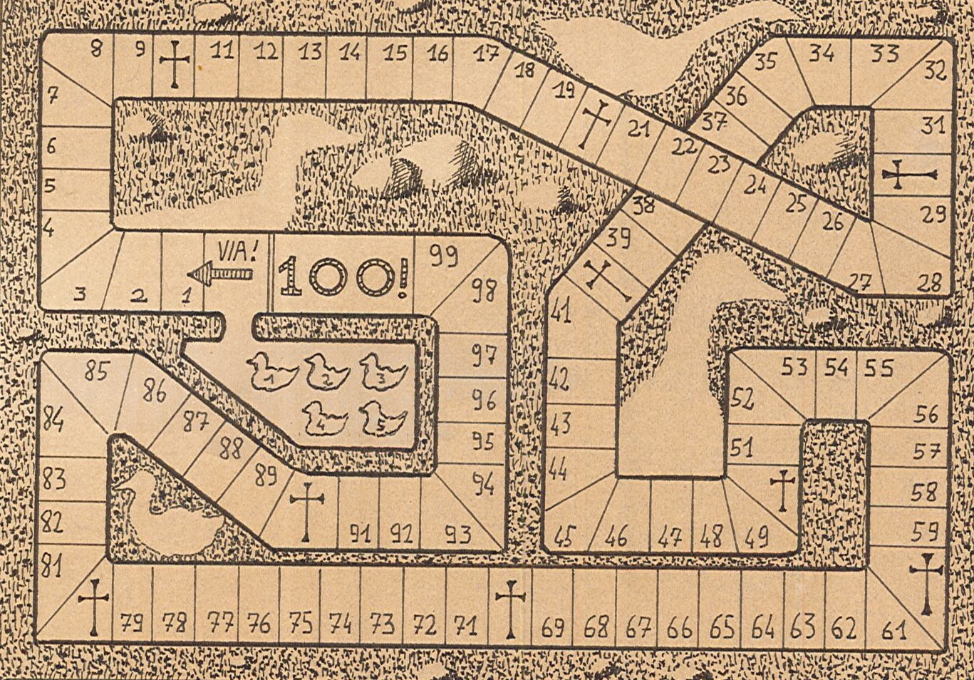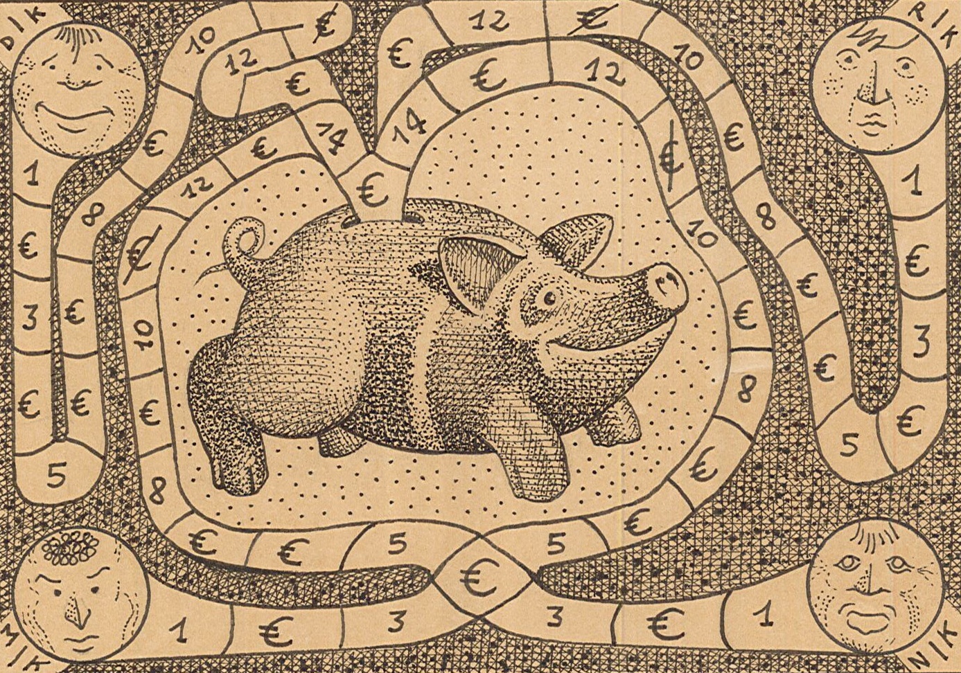 Marcello Carrà, dalla serie Minigiochi ingiocabili, 2018, penna su carta tinta con caffè, 12×8 cm: Gioco dell’elefante; Gioco dell’oca; Gioco del salvadanaio; Gioco del camaleonte; Gioco di Pinocchio.