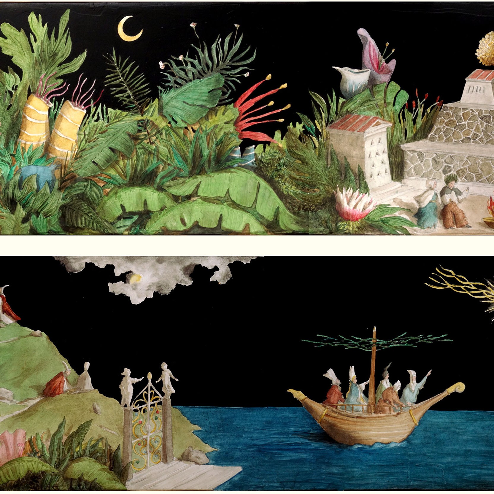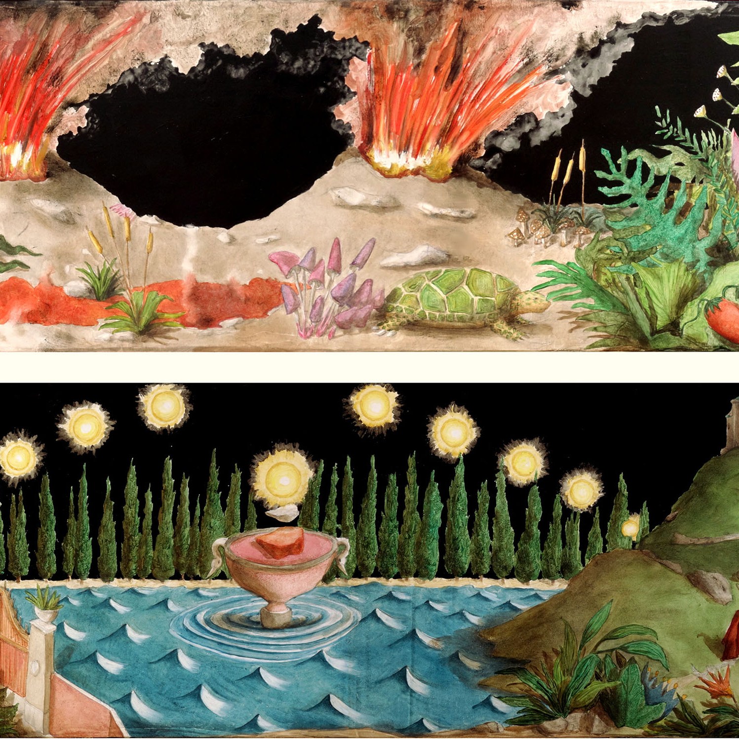 Carlotta Baldazzi, pittura e collage digitali, dimensioni variabili: Adamia, 2020; Eliosaura, 2021; Fermia, 2020; Serpinia, 2020; Mietitora, 2020; Ipnomachia, 2020; Dualia, 2021.