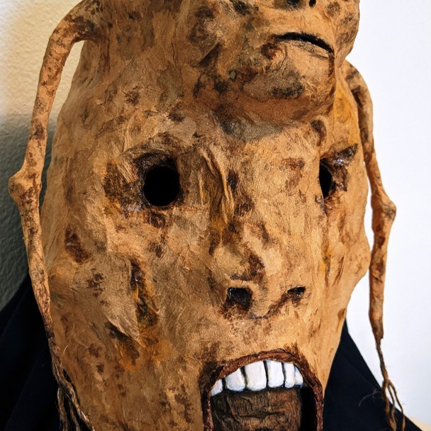 Giulio Artioli, Maschera del Resettore di Deleuth, 2021, lattice liquido, legno, cartapesta, inchiostro, 14x18x28 cm.