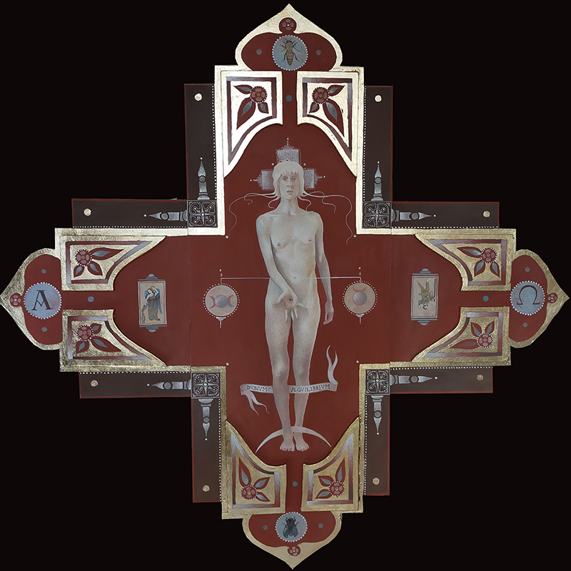Emiliano Alfonsi, Il dubbio e l’equilibrio, 2021, tempera e oro 22 kt su tavola volumizzata, 100×100 cm.