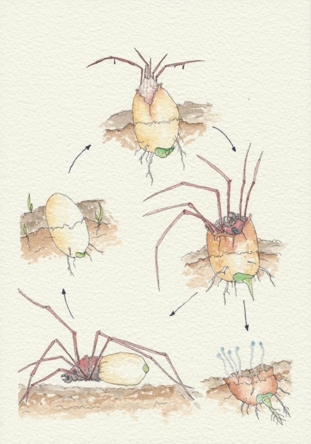 Nell’illustrazione possiamo osservare il ciclo vitale della specie: da un ovulo fungino si sviluppa sia un embrione femmina di aracnide, sia un’ifa fungina. L’embrione al terzo stadio è già in grado di nutrirsi catturando piccole prede dall’interno dell’ovulo fungino aperto. Gli scarti dei pasti arricchiranno il terreno circostante, aumentando la crescita delle ife. Nello stadio finale la femmina, durante l’uscita dall’ovulo, catturerà le spore dai corpi fruttiferi del miceto. In questo modo la femmina adulta potrà riprodursi nuovamente, deponendo nuovi ovuli fungini che a loro volta svilupperanno nuovi miceti in aree più distanti da quella di origine.
